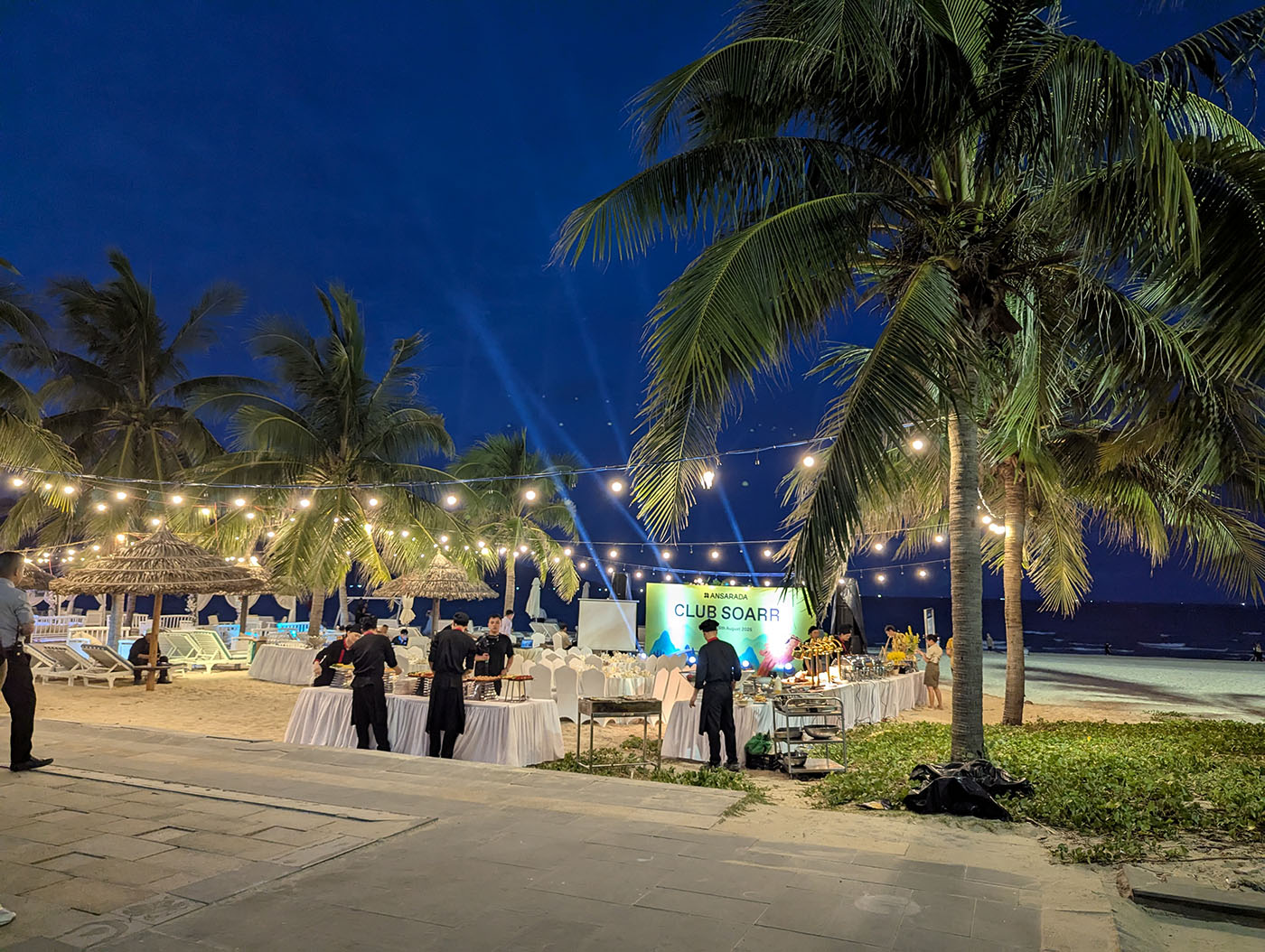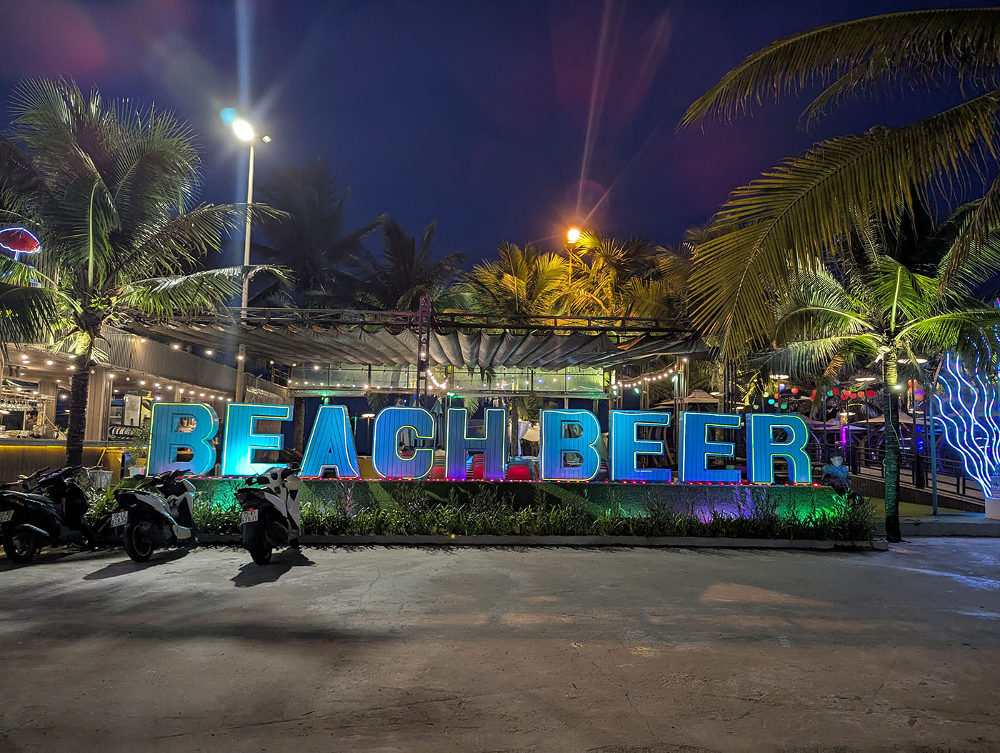 企業イベントの準備が進むビーチでは、ライトとヤシの木がきらびやかに光っていた。巨大な「BEACH BEER」のネオンも輝き、周囲は完全に“パーティーモード”。海鮮レストランも派手な照明に包まれていたが、この日の気分ではなく、入店は見送り。