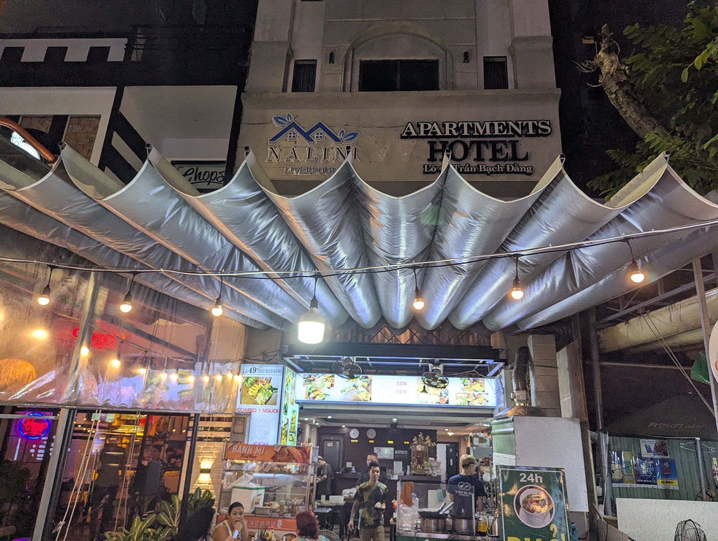 バインミーの屋台とステーキプレートを出す小さな店で、鉄板の上でじゅうじゅうと音を立てる牛肉と目玉焼き、フランスパンのセットを注文。隣のテーブルではギター一本の生演奏が始まり、観光地とは違う、ゆるい夜の空気に包まれる。