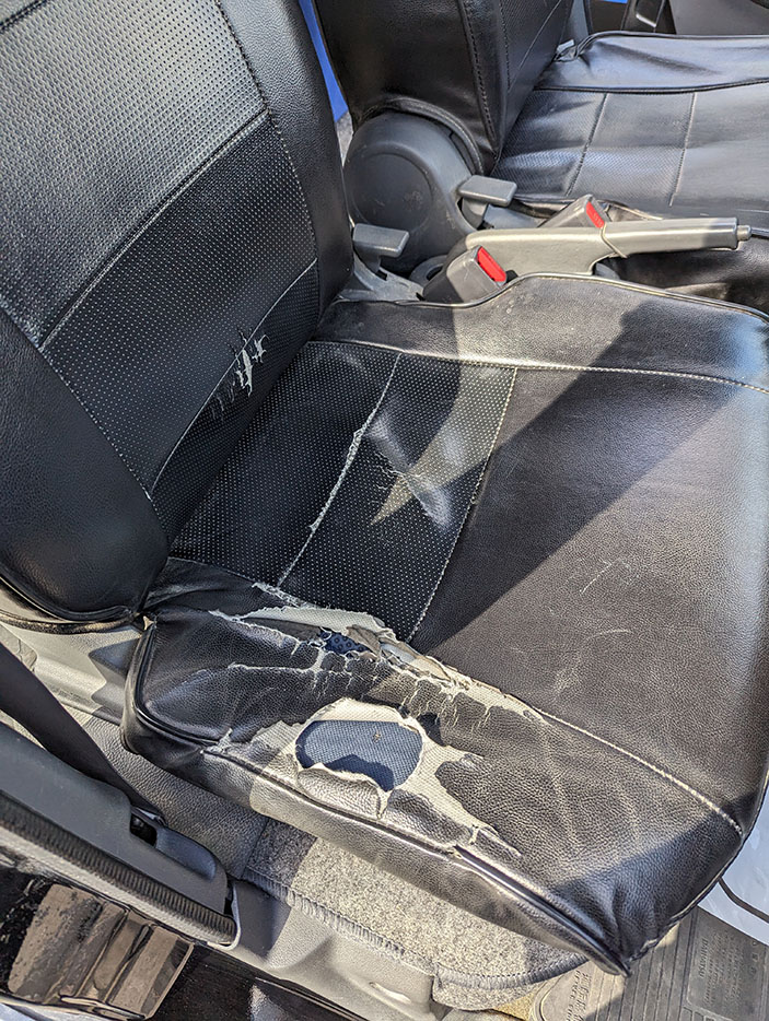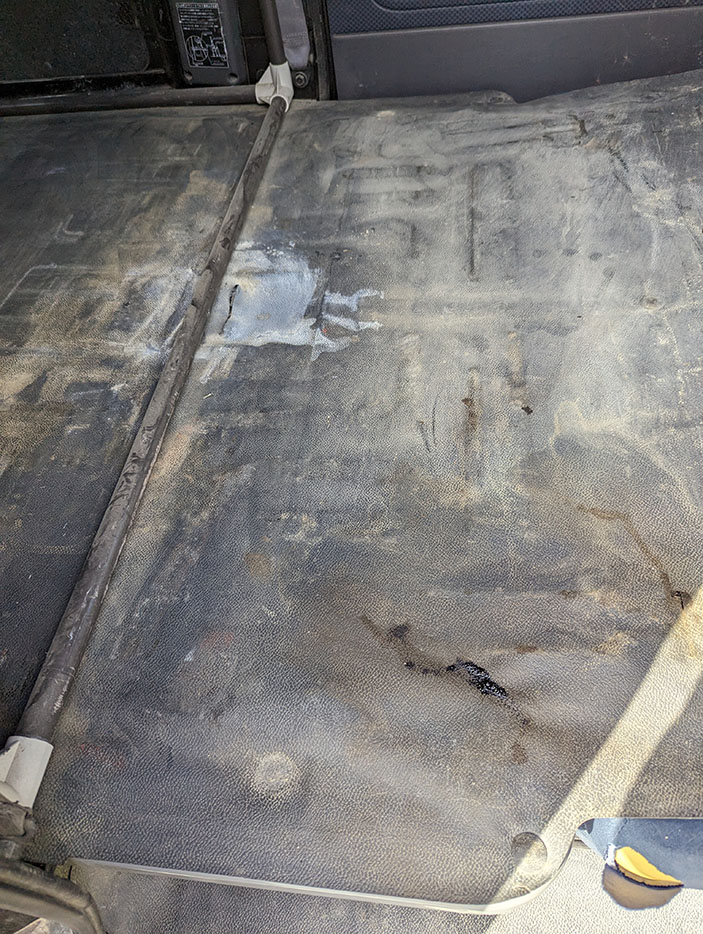 走行距離は13万kmを超えていて、後部座席のシートは破れ、汚れが目立つ。荷室のシートには埃まみれのシミが広がり、車外のあちこちには荷物の積み下ろしでできたと思われる傷が刻まれていた。