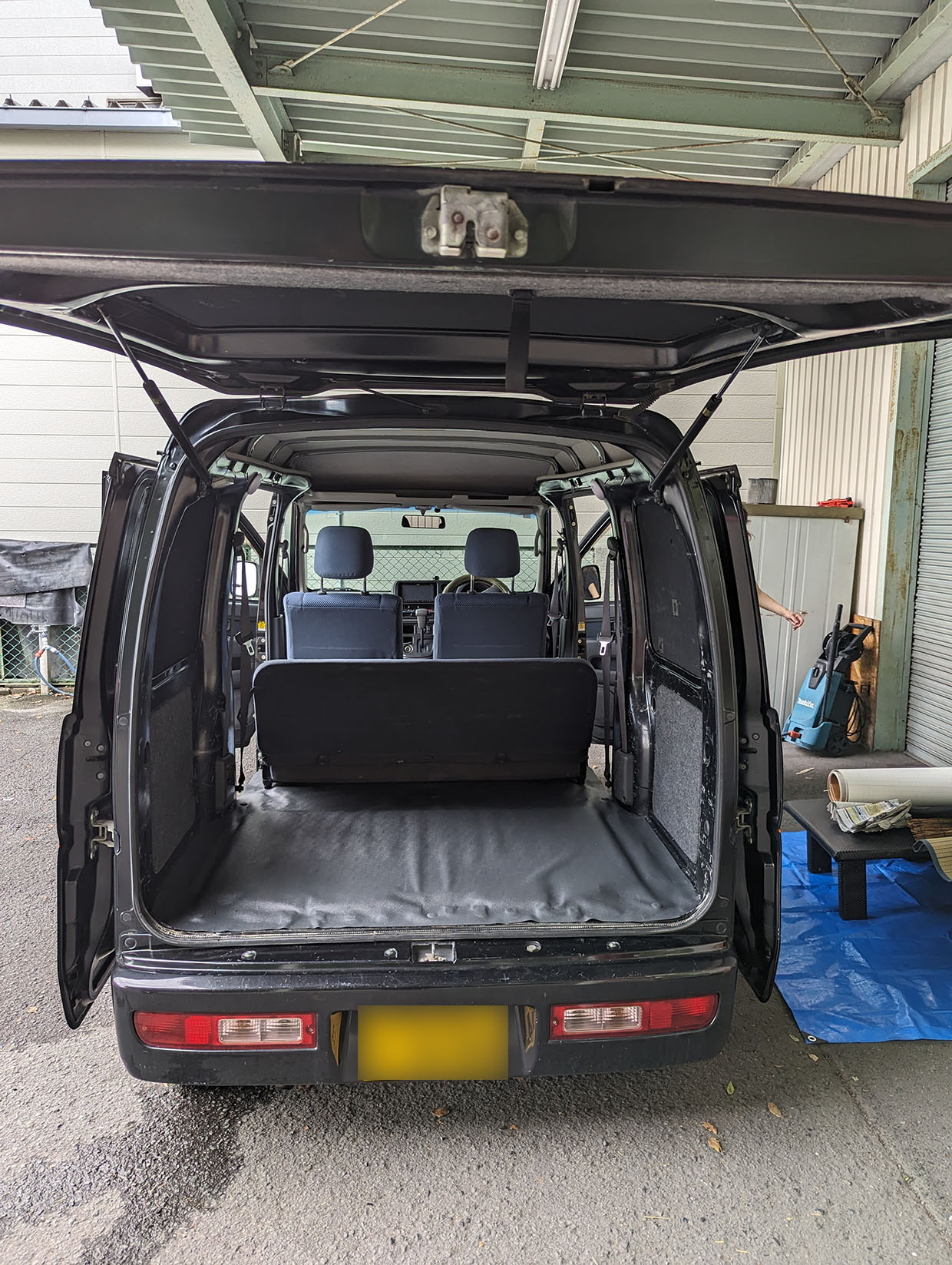 14時10分、作業スタート。まずは車内の板や備品をすべて外す。この準備が地味に重要で、作業効率を大きく左右する。