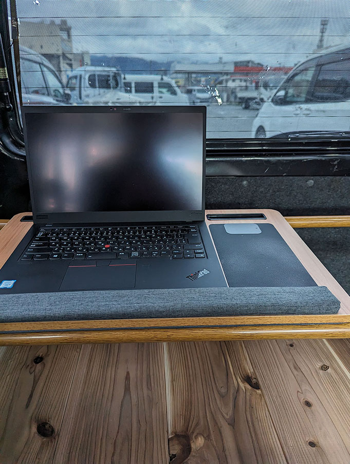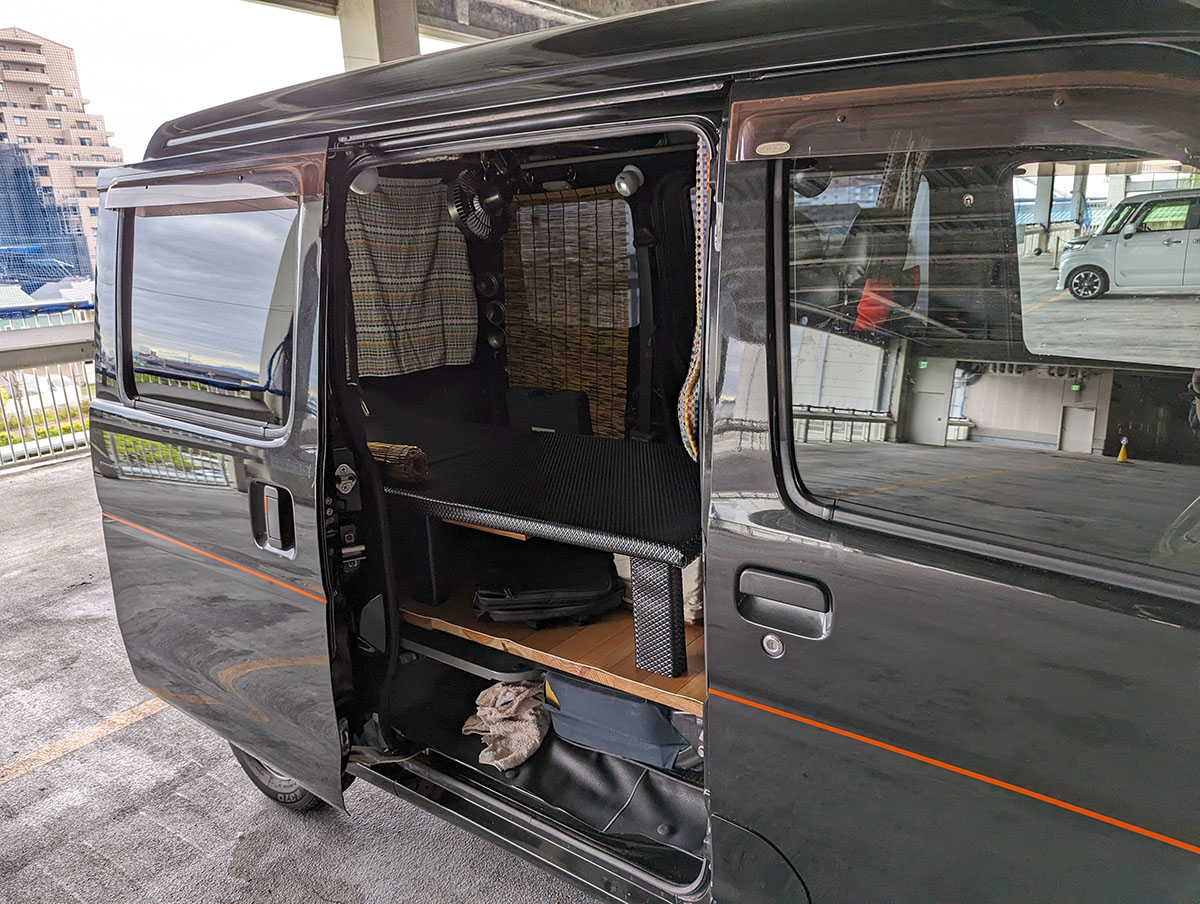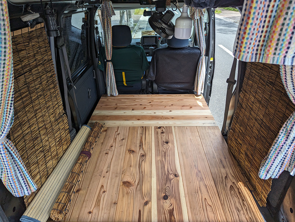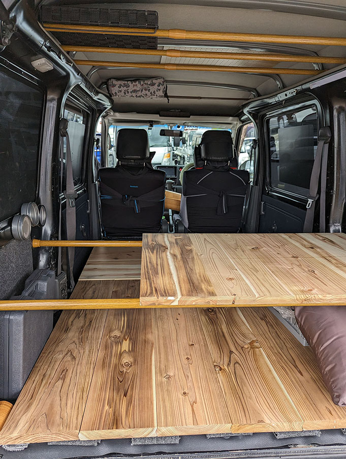 この板が、移動部屋になるハイゼットに温かみを加えてくれる。