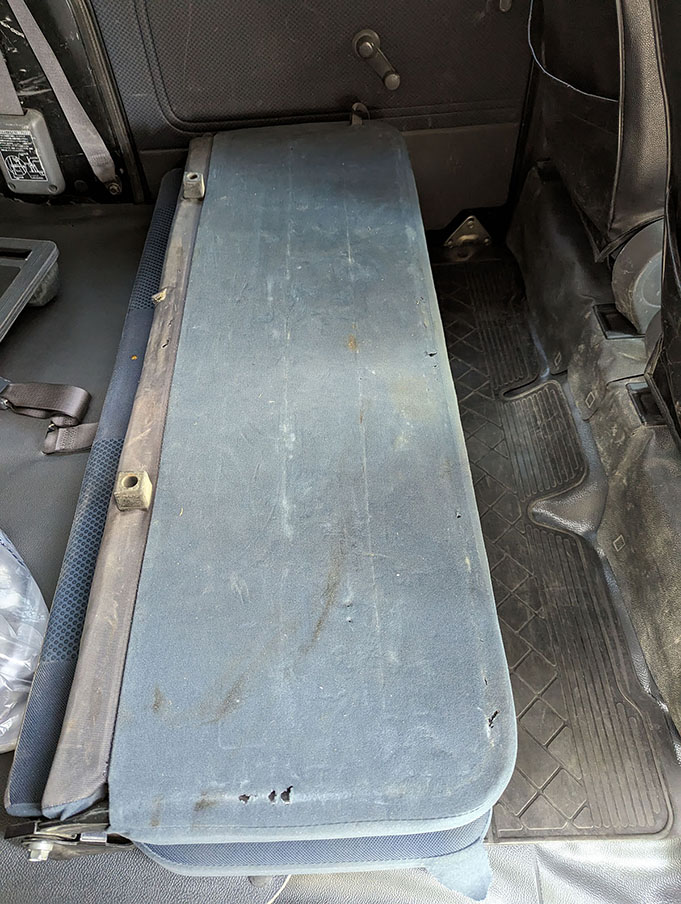 後部座席。ベンチシートタイプ。こちらも汚れている。叩けばホコリがしっかり舞い上がった。破れとシミ以外の汚れはリンサーを使えば何とかなりそうかな。