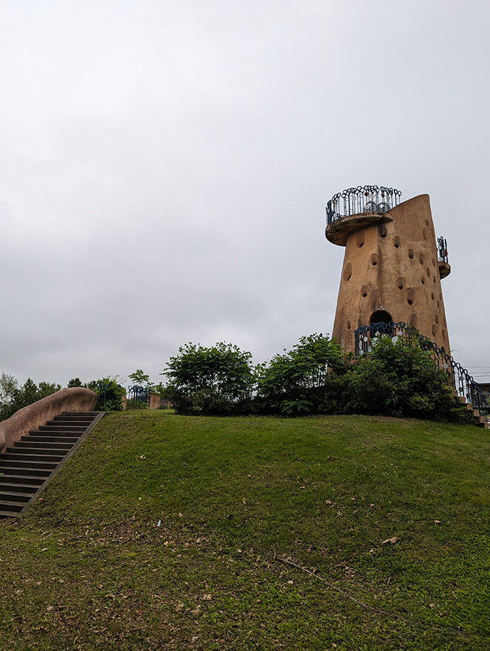 6時に「明野ヶ丘公園」に到着。この公園には、どこかガウディを思わせるユニークな建造物が、、、名前は「ピラ・リ」