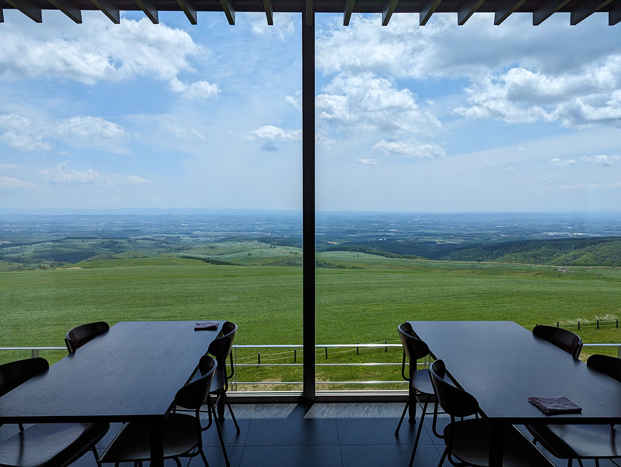 広大な牧場の風景が目の前に広がり、ナイタイテラスからの景色はまさに絶景だった。地平線まで続く緑のじゅうたんに青空が映え、リフレッシュには最高のロケーションだ。ベンチに座り、風が強く肌寒い中、総菜を味わう。