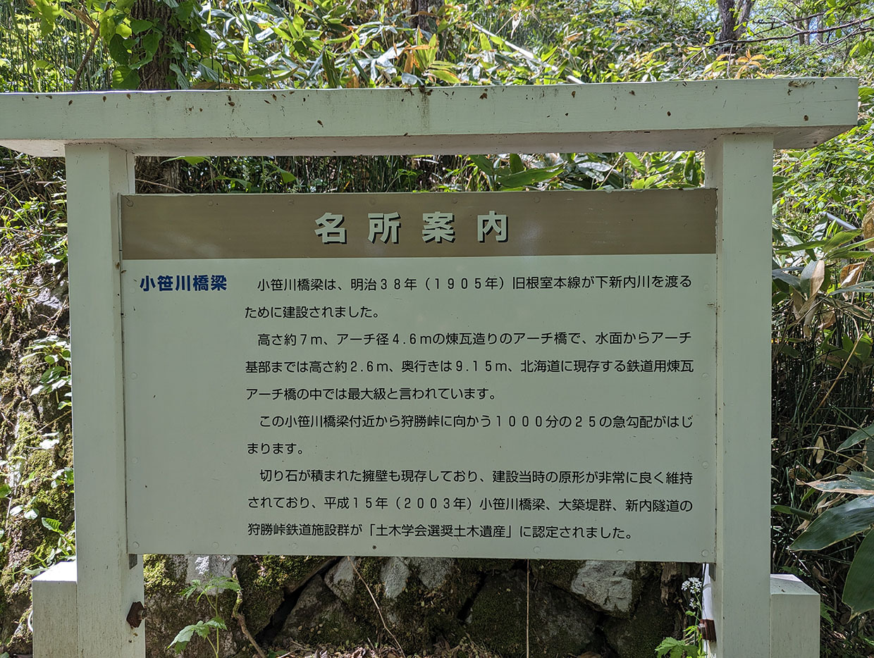 切り石が積まれた擁壁も現存しており、建設当時の原形が非常に良く維持されており、平成15年(2003年)小笹川橋梁、大築堤群、新内隧道の狩勝峠鉄道施設群が「土木学会選奨土木遺産」に認定されました。