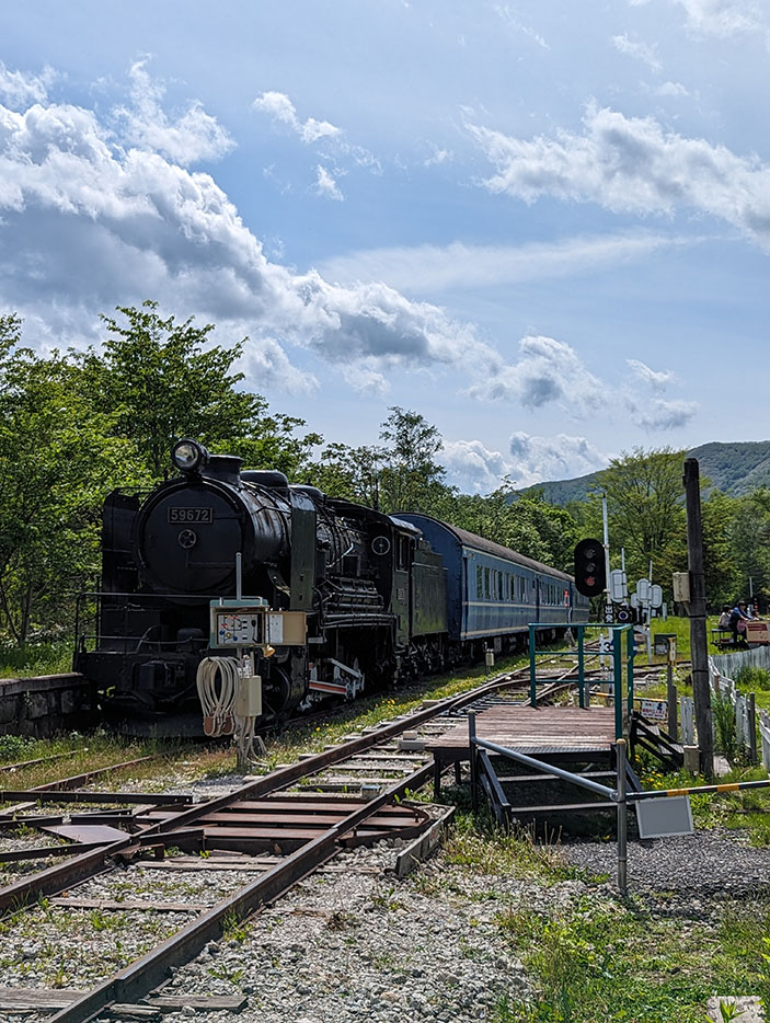ここでは親子連れや年配の方がトロッコを楽しむ微笑ましい光景が広がり、近くにはSLの展示もあった。