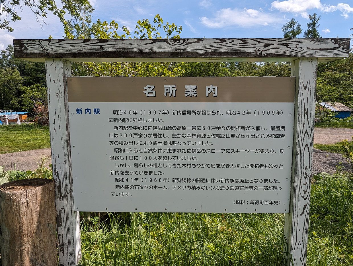 新内駅を中心に佐幌岳山麓の高原一帯に50戸余りの開拓者が入植し、最盛期 には200戸余りが居住し、豊かな森林資源と佐幌岳山麓から産出される花崗岩等の積み出しにより駅土場は賑わっていました。