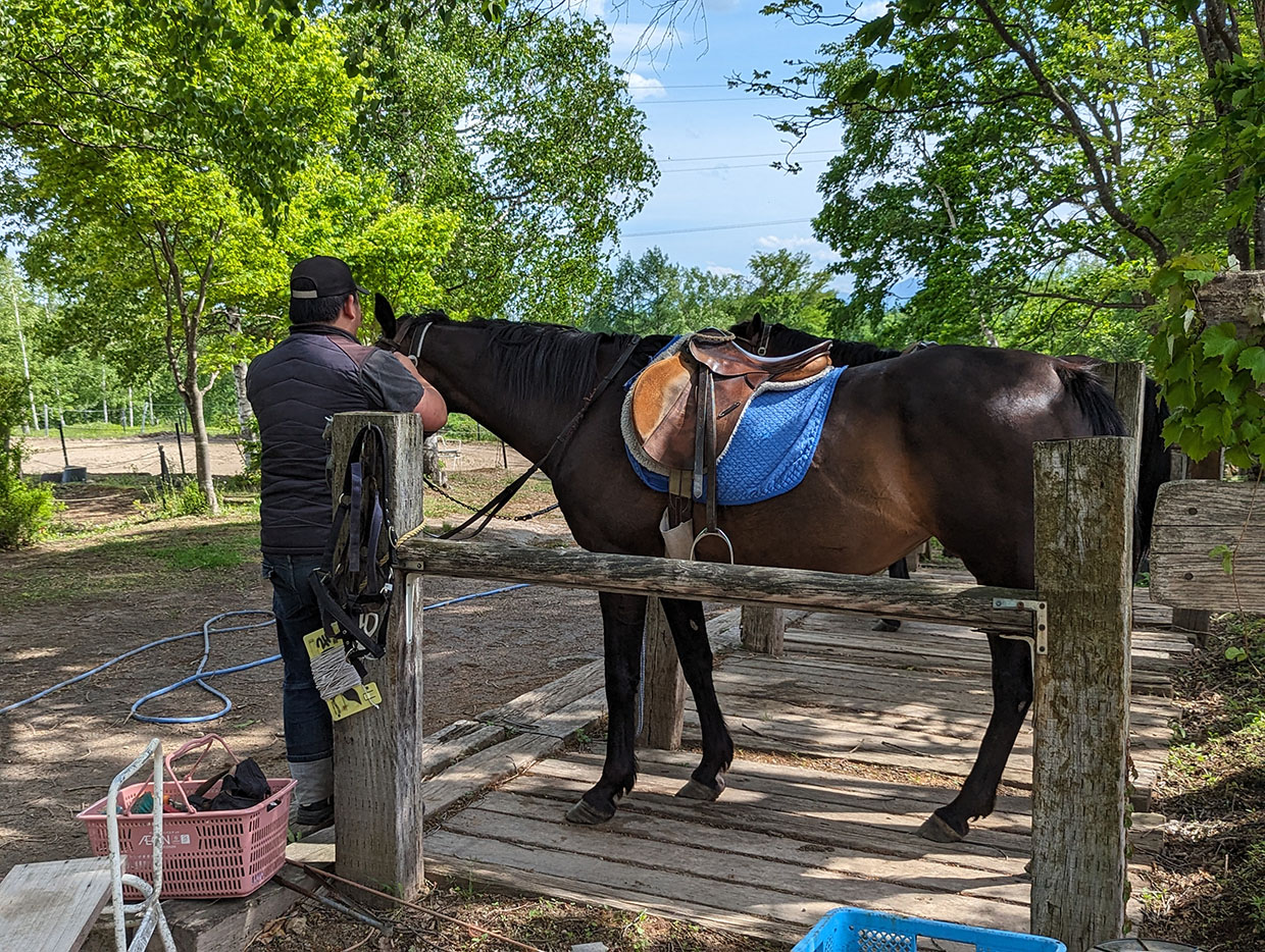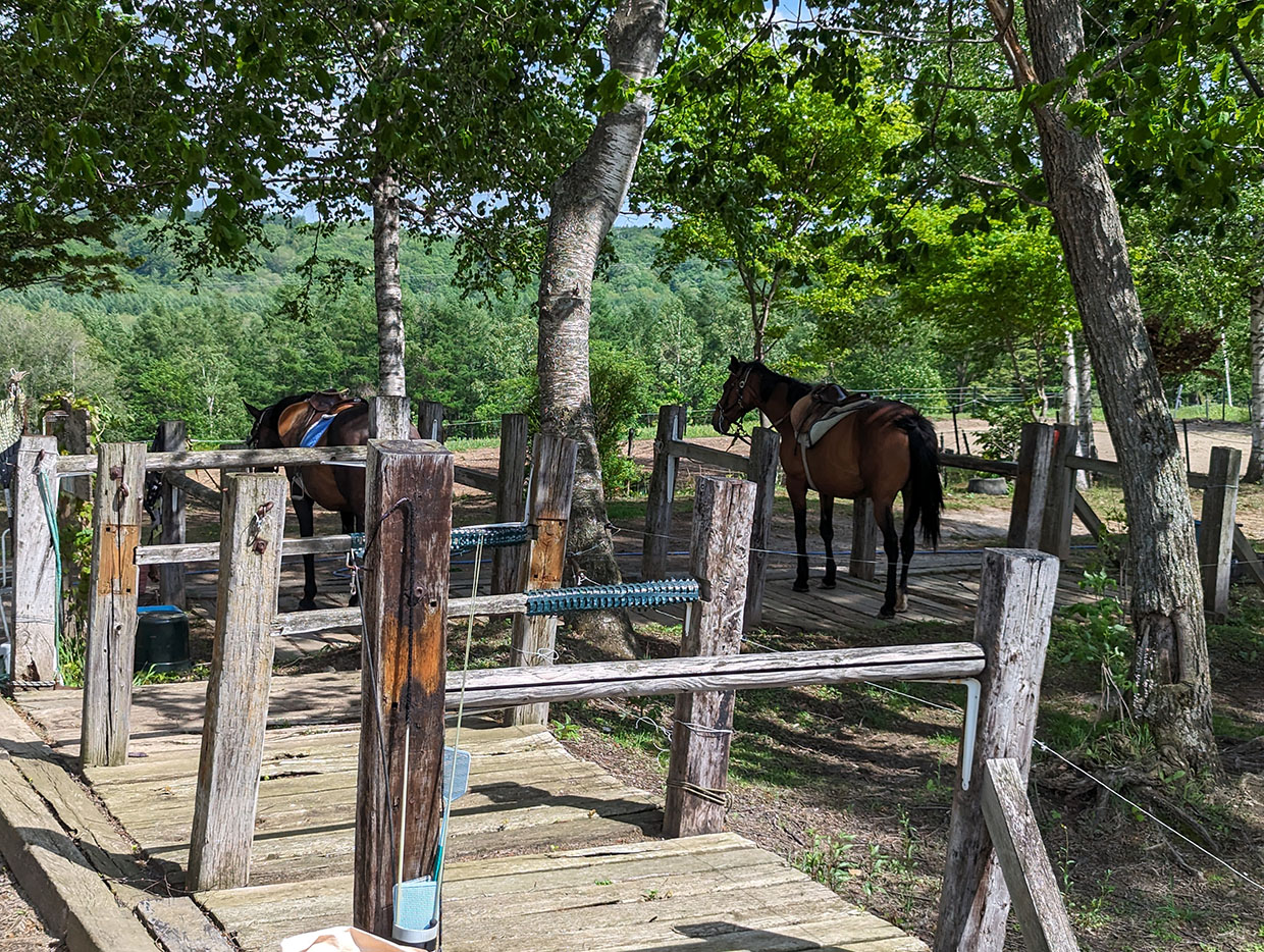 ナイタイ高原牧場での昼食後、12時半に「ヴィレッジ432」で乗馬ハイキングコースを申し込んだが、馬の休憩時間の関係で14時スタートとなった。