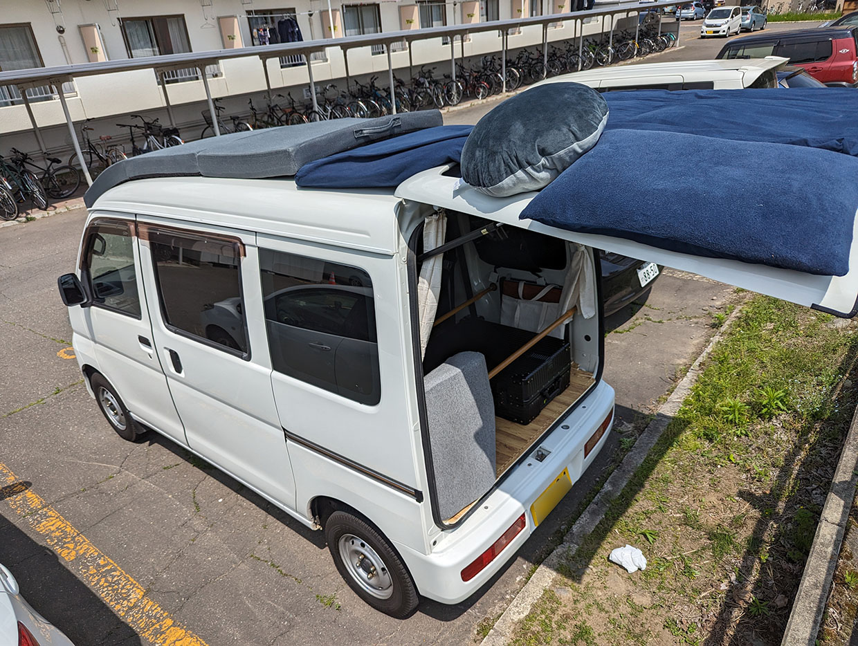 帯広の拠点で5時半起床。朝の空気が清々しい中で、まずはシャワーを浴びて気分をリフレッシュする。洗濯を済ませた後、外を見ると雲一つない快晴だったため、車の屋根に布団とマットレスを干すことにした。