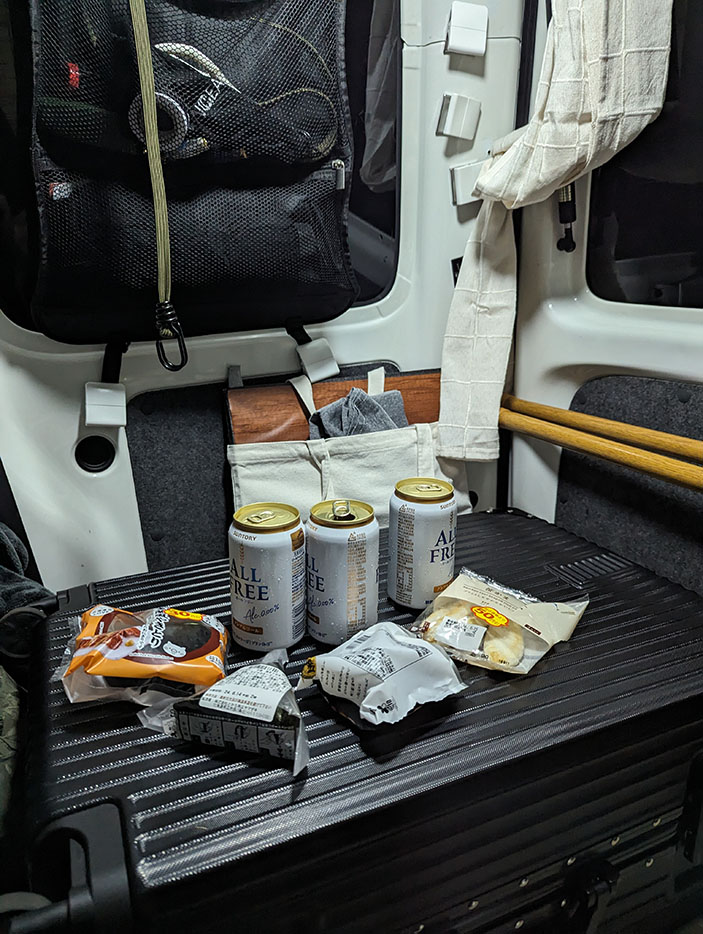 21時45分に拠点へ戻り、22時15分には「道の駅おとふけ」に向かう。途中のローソンでおにぎり2個、笹かまぼこ、ノンアルビールを購入し、車内で簡単な夜食をとる。