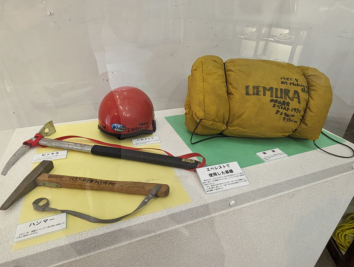 エベレストで使用した装備(寝袋。ヘルメット、ピッケル、ハンマー)
