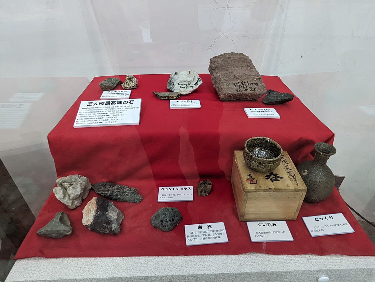 モンブラン(ヨーロッパ大陸最高峰:1966年7月登頂)、キリマンジャロ(アフリカ最高峰:1966年10月)、マッキンリーの石(北米大陸最高峰:1970年8月単独登頂。単独登頂者となる。)、エベレストの石(アジア大陸、世界最高峰:1970年5月21日松浦輝夫とともに日本人として初登頂)、アコンカグアの石(南米大陸最高峰:1968年2月単独登頂)、グランドジョラス(1971年1月グランドジョラス北壁を完登)、南極の石(1972年初めての南極偵察にあらわれたときアルゼンチン陸軍のベルグラーノ基地周辺で採取)、五大陸最高峰の石で作ったぐい呑み、グリーンランドの石を材料に作ったとっくり。