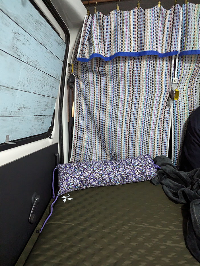 新得の「そばの館」で買ったそばがら枕。運転席を仕切るカーテンは突っ張り棒とクリップ付カーテンレールと今治バスタオルを利用。タオル地のカーテンはカーテンとタオルの2役をこなしてくれる。後部座席の横のガラスは窓型にカットしたプラ板に木目のリメイクシートを貼ったものをはめこんだ。プラ板の上下のどちらかにテープでつまみを作っておくと外すときにスムーズ。