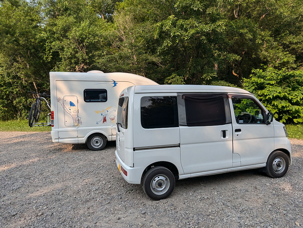 先日の清里オートキャンプ場よりも、週末金曜日ということもあってか層雲峡オートキャンプ場の方が利用者がやや多く感じた。特に目に留まったのは、近くに停めていたソロキャンプを楽しんでいる人が2人。それぞれタープ、テントなどのアウトドア環境をしっかり整えて、BBQセットから漂ってくるいい香りがなんとも羨ましい。
