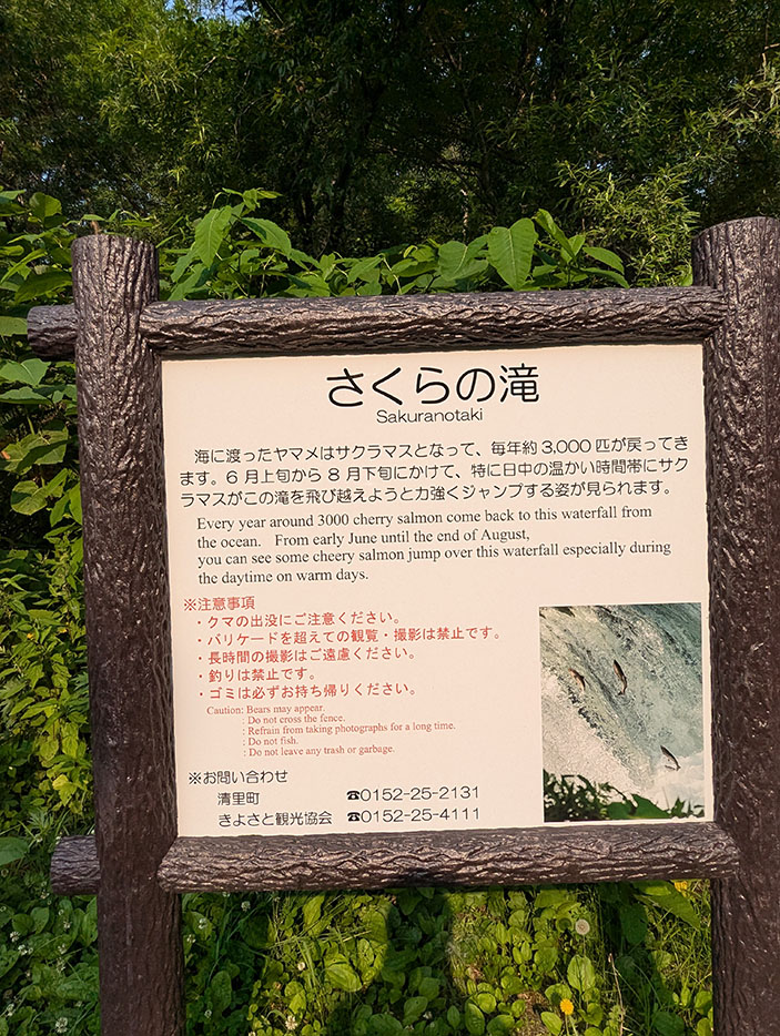 6時50分、さくらの滝に到着すると、すでに観光客が三組ほど来ており、大分ナンバーのキャンピングカーも停まっていた。この滝は高さ約3メートル、幅約20メートルの小さな滝だが、6月上旬から8月下旬にかけて、特に日中の温かい時間帯にサクラマスがこの滝を飛び越えようとジャンプする姿が見られる。海に渡ったヤマメがサクラマスになって3000匹ほど戻ってくるのだ。