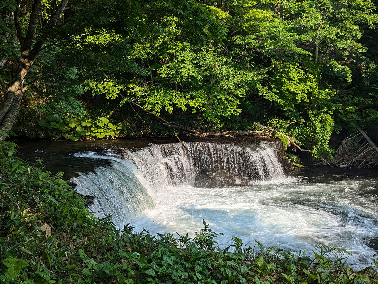 実際に滝を観察すると、マスが勢いよく水流を飛び越えようとする姿が何度か目に入り、自然の力強さに思わず感動してしまった。体全体を使って懸命に滝を登ろうとする姿は生命力そのもので、目の前の自然のドラマに引き込まれる。滝の周辺は緑が豊かで、涼しげな雰囲気が漂い、朝のひんやりとした空気が心地よかった。