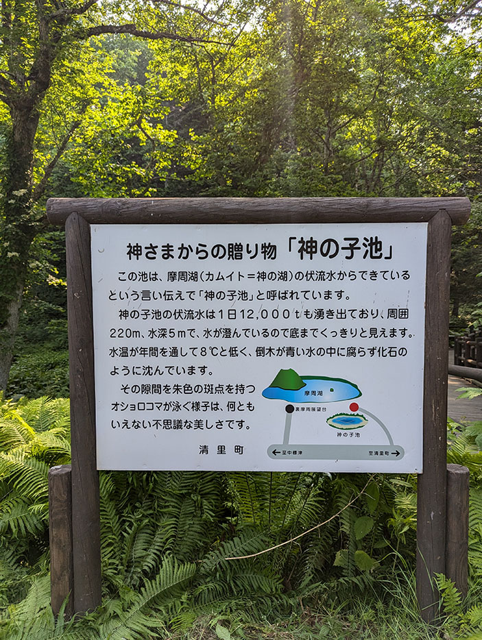 「神の子池」は、摩周湖から地下でつながっていると言われる湧き水が満たす直径約220メートルの池だ。水温は年間を通して約8度に保たれており、どんな季節でも澄み切った青い水が静かにたたえられている。その透明度は驚くほど高く、池の底に沈んでいる倒木が鮮明に見える。倒木は腐ることなく青い水に包まれていて、この池が「神秘的」と称される理由が一目で理解できる。