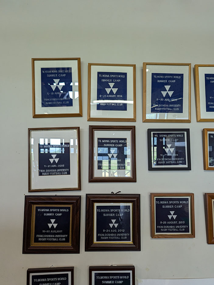 施設内を歩いていると、食堂に同志社大学と立命館大学のペナントが飾られているのが目に留まった。ラグビー部の合宿で訪れた際に贈られたものらしい。最近では立命館は合宿を行っていないが、同志社大学は8月上旬から合宿を予定しているとのこと。学生たちが暑い夏の中で汗を流しながら練習に励む姿が目に浮かぶ。
