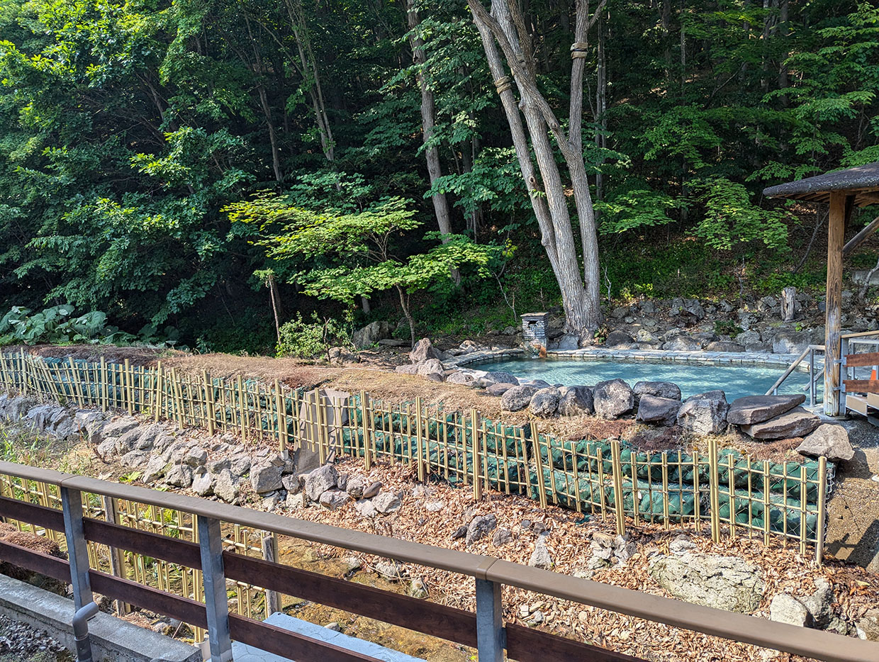 露天風呂では、木々の緑や澄んだ空気を感じながら、のんびりと温泉に浸かることができる。