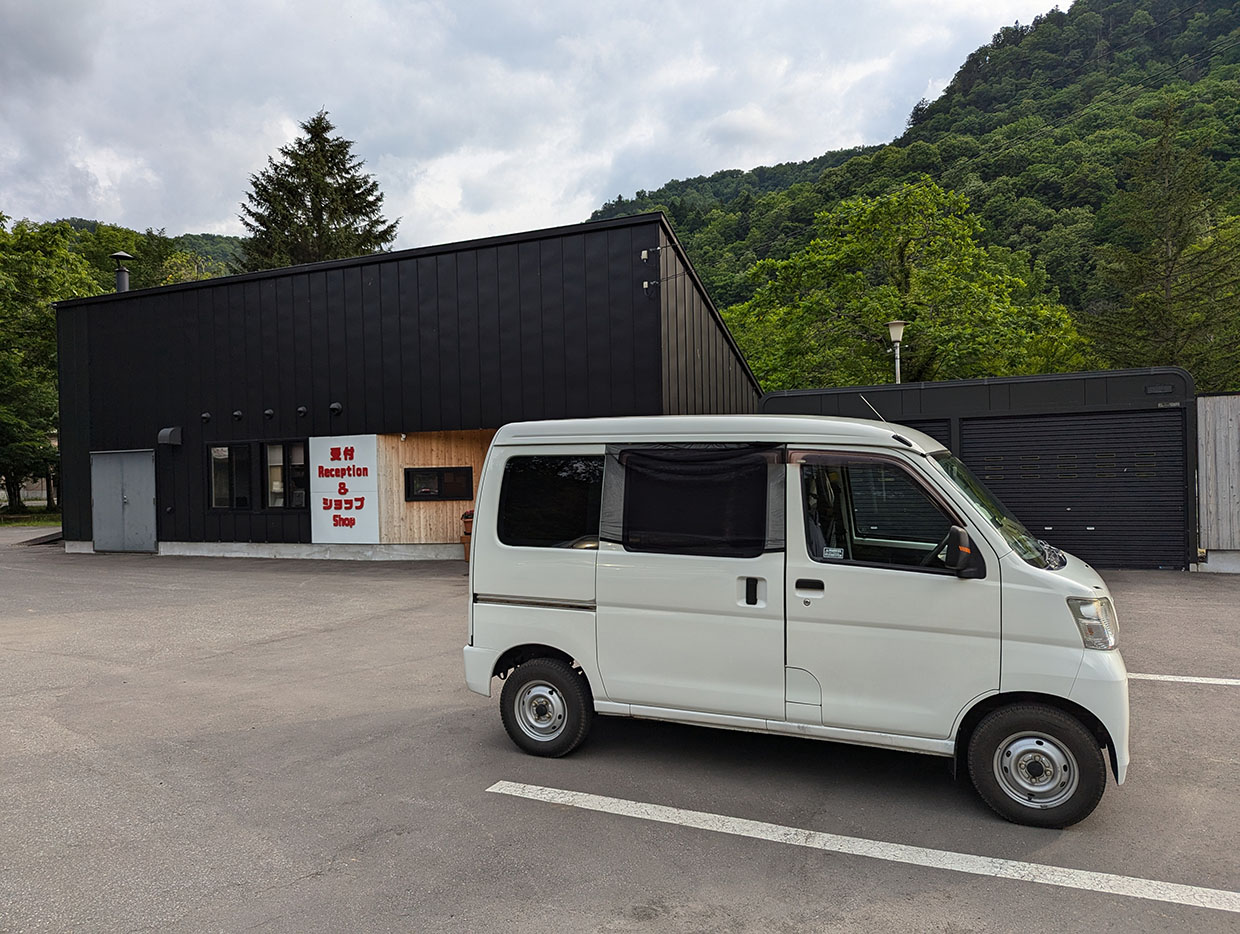 16時50分、層雲峡のセブンイレブンで食材を購入し、17時に層雲峡オートキャンプ場に到着。ここは大雪山系の麓に広がる自然豊かなキャンプ場で、層雲峡温泉街にも近い便利な立地。