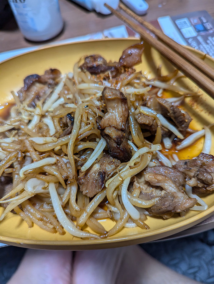18時半、晩酌スタート。ビール2本にチューハイを開けて、きんぴらゴボウ、玉子焼き、豚のサガリともやし炒めをつまむ。窓の外では雨音が優しく響いている。「これぞ至福の時間やな」とほろ酔い気分でしみじみ思う。雨が旅の終わりを少しだけ特別なものにしてくれる。