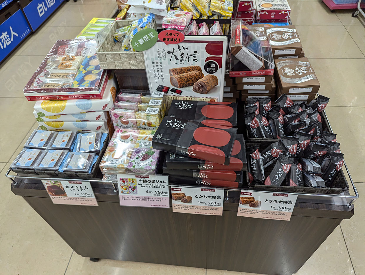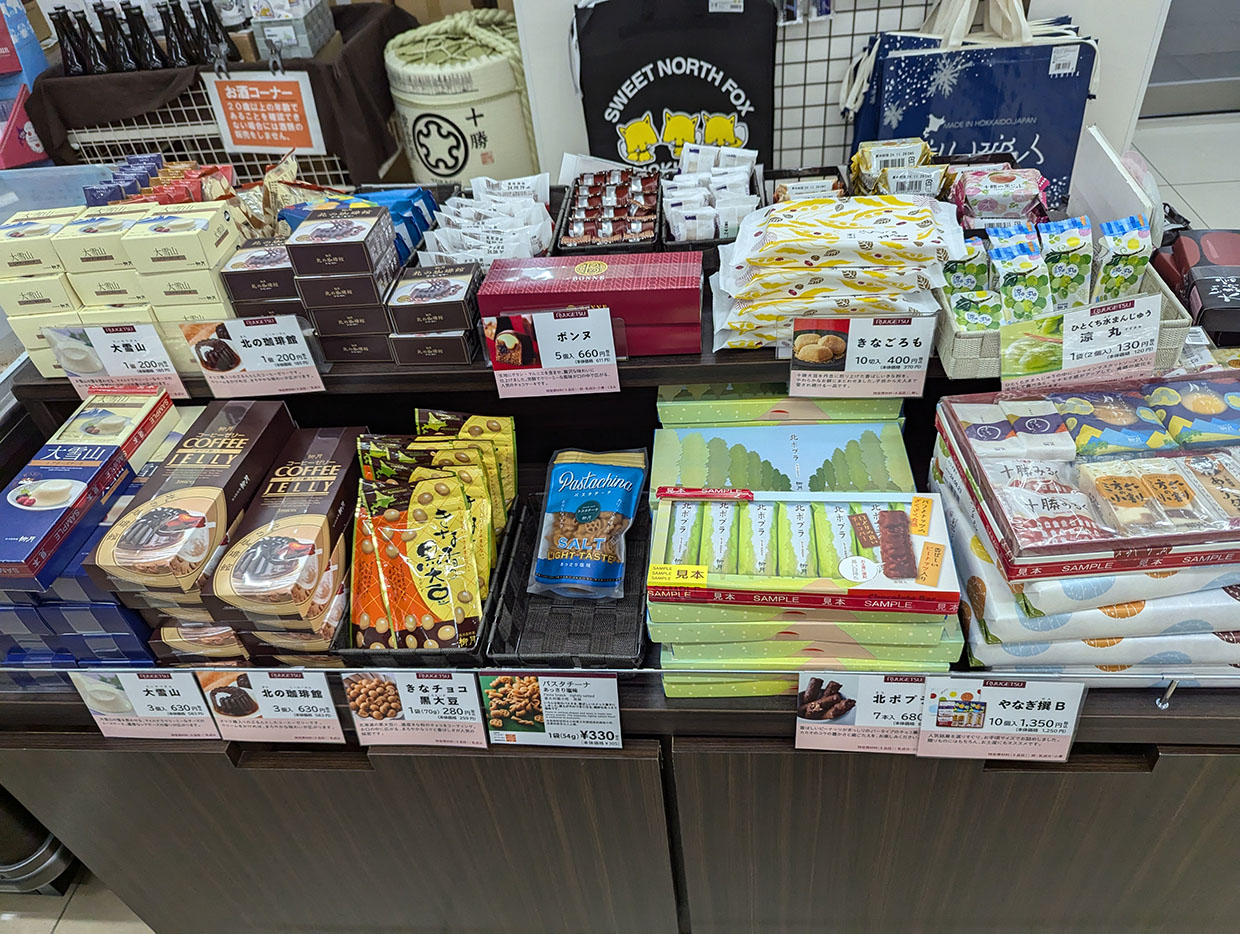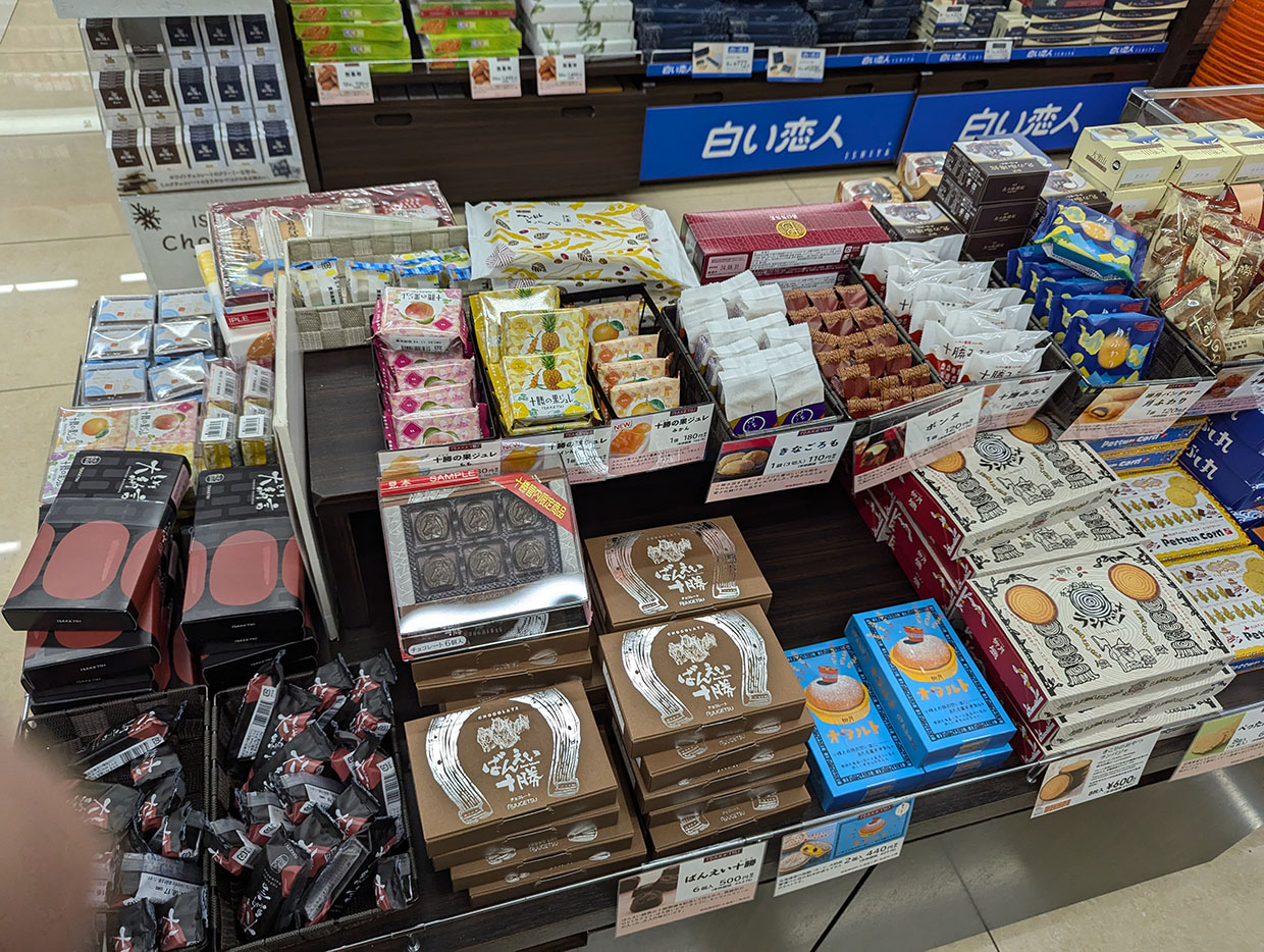 目に留まったのはお土産コーナーに並ぶ柳月のお菓子たち。「これはええやん」と思い、個包装のものを6種類1個ずつ購入。