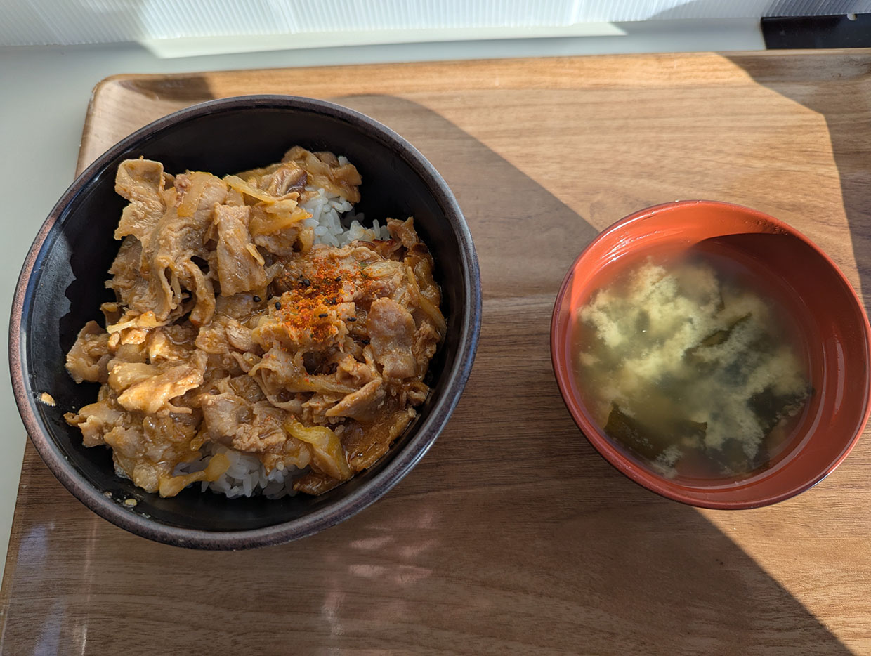 大学の学食で辛味噌豚丼と味噌汁をいただく。