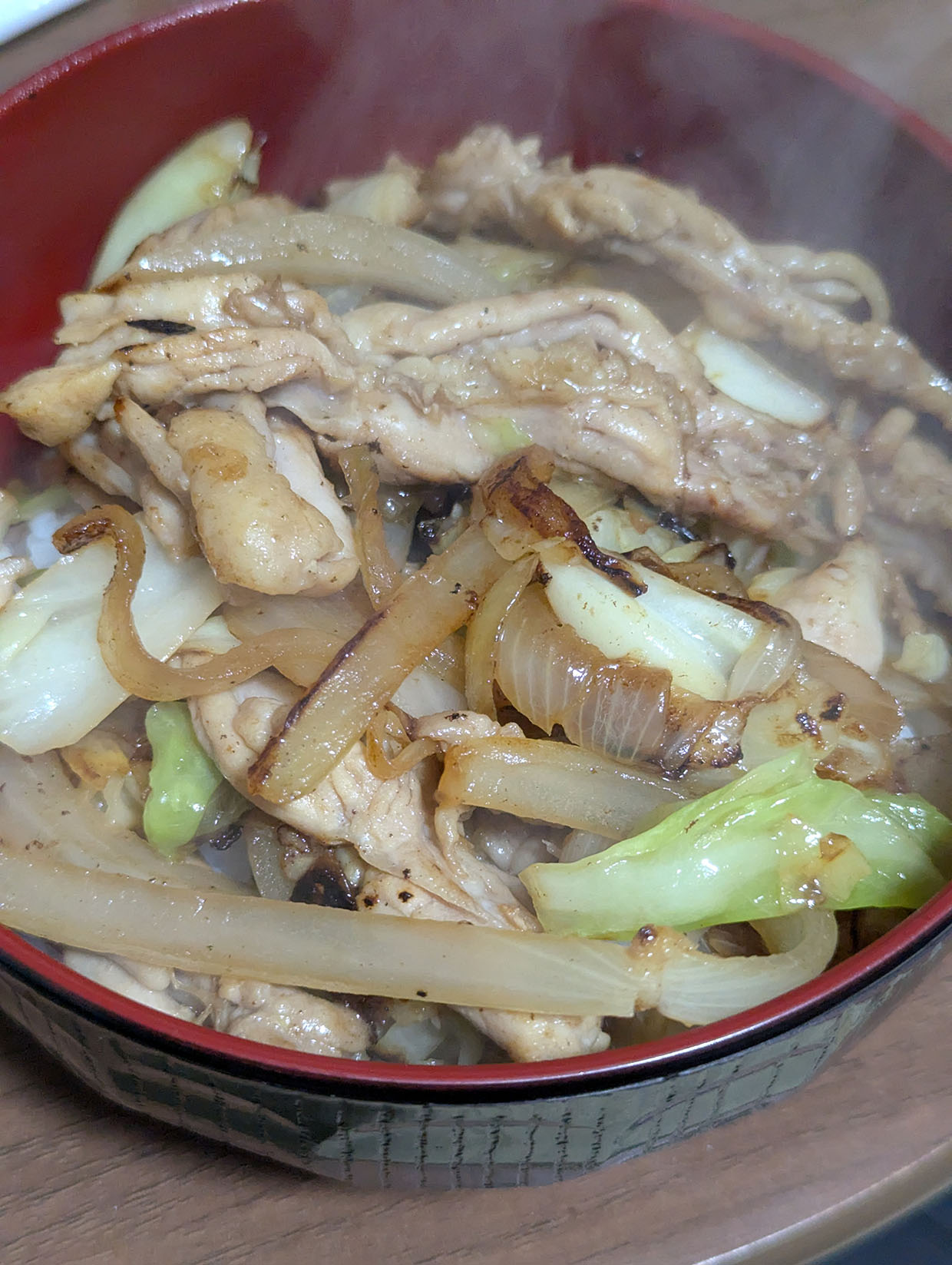 解凍しておいたせせりと玉ねぎ、キャベツを炒めてせせり丼を作ることにした。