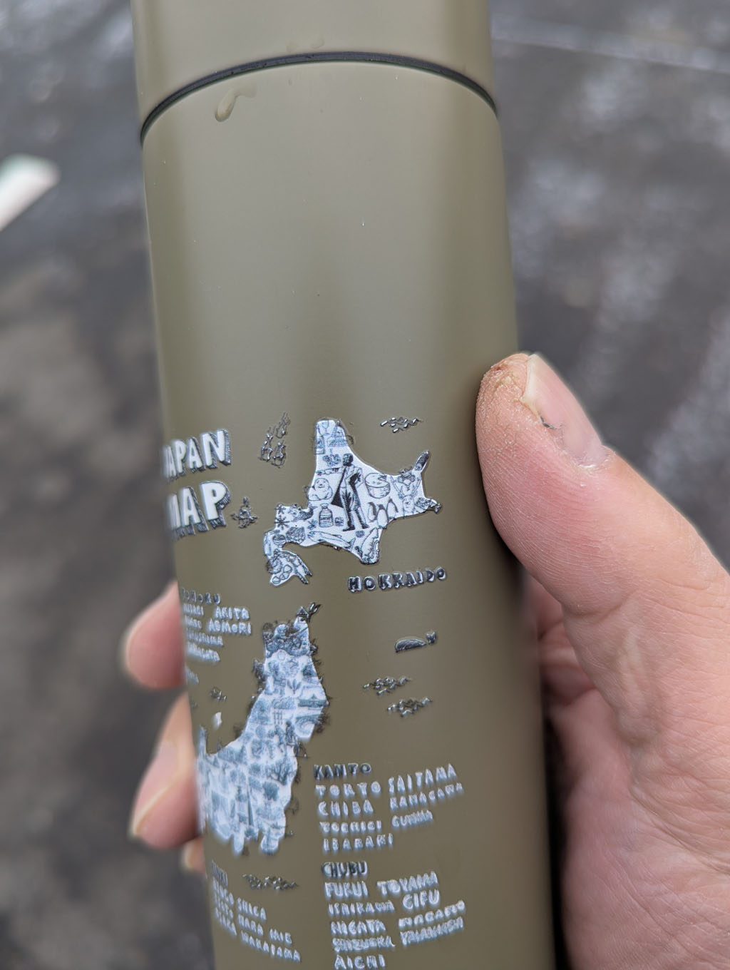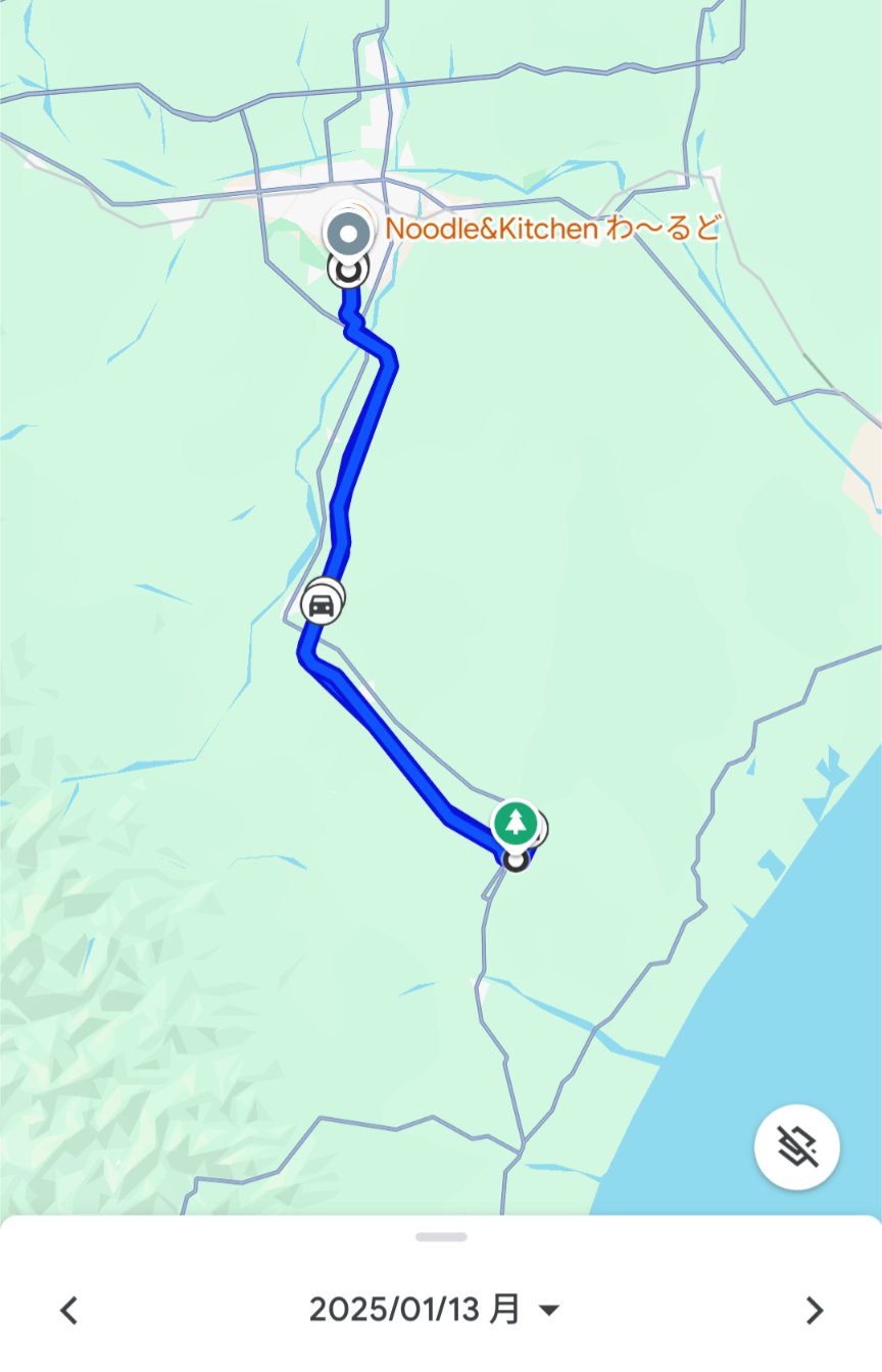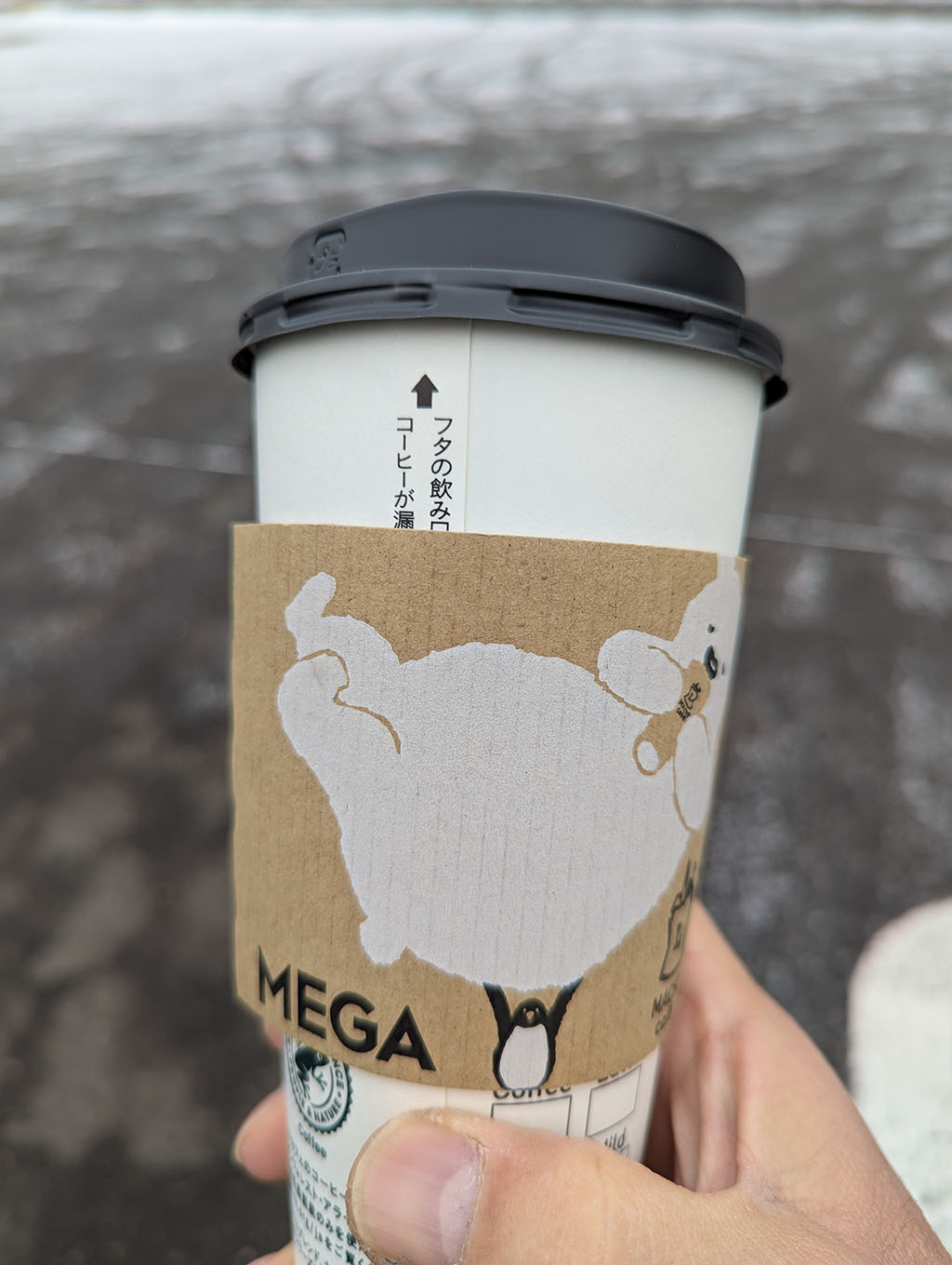 2025年1月13日(月)、7時45分に起床すると、小雪がちらつき車には薄く雪が積もっていた。8時5分、ローソンでメガホットコーヒーを購入し、水筒に入れて保温。これが最近の旅のお供として定番になりつつある。