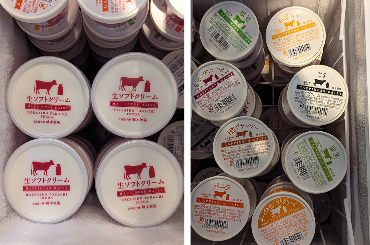 温泉の後は、売店で売っていた嶋木牧場の、生ソフトクリームを購入。さらに、十勝ブランデーやバニラ、かぼちゃ風味のアイスクリームも買い足し、合計1,980円。どれも十勝の自然が育んだ濃厚な味わいが楽しめる一品だ。