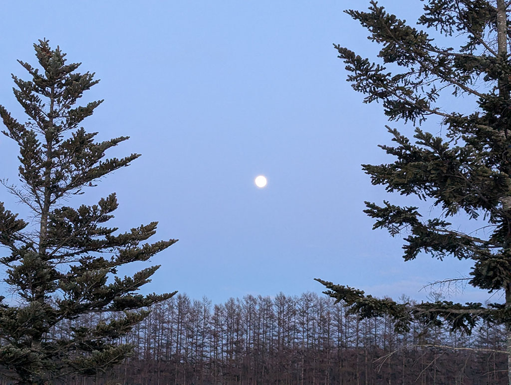 右(東)の空には、まん丸のお月様が顔を出す。一方、西の空には曇りの中にほんのりと夕焼けが見え隠れする。夕日と満月が同時に楽しめるこの瞬間は、北海道の広大な風景ならではの贅沢な自然の神秘に思いを馳せる。