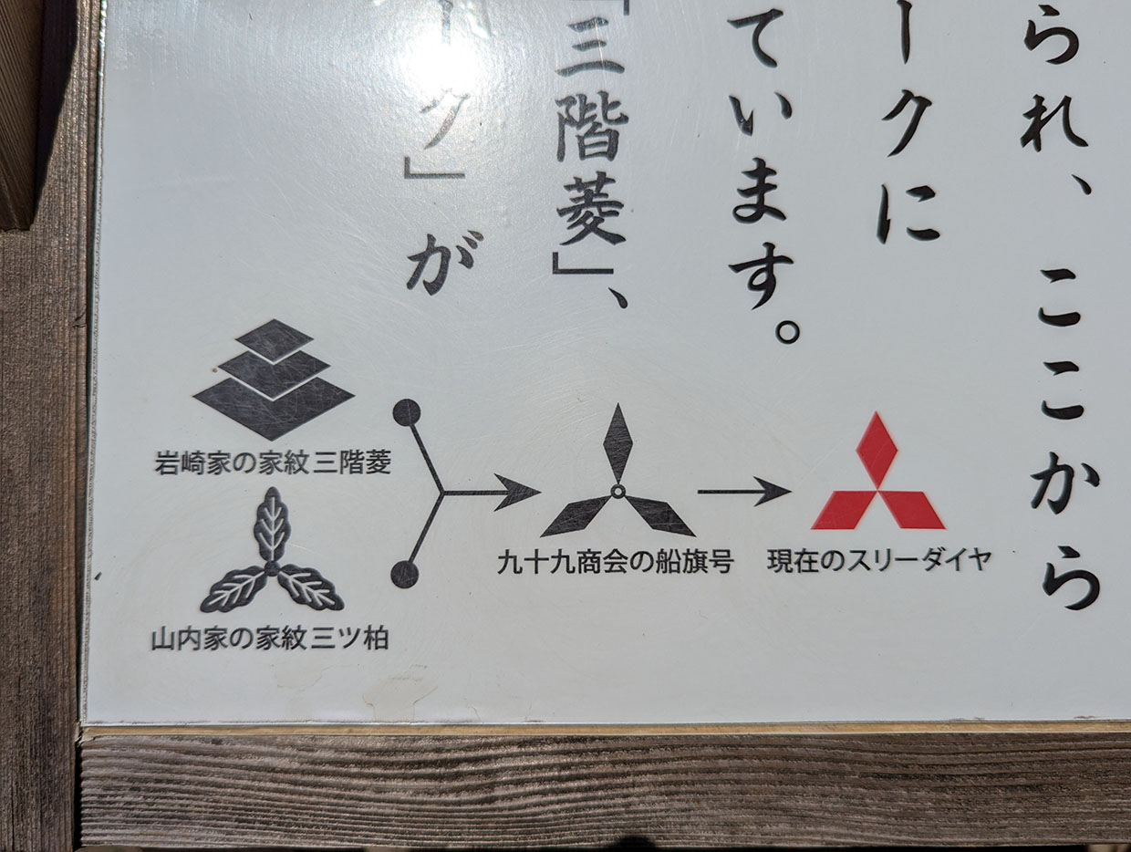 三菱マークの由来。岩崎家の家紋3階菱と土佐藩主山内家の家紋三ツ柏を組み合わせて九十九商会の船券号が作られ、ここから現在の三菱マークになったと言われています。土蔵の鬼瓦に「3階菱」、白壁に「三菱マーク」が見られます。