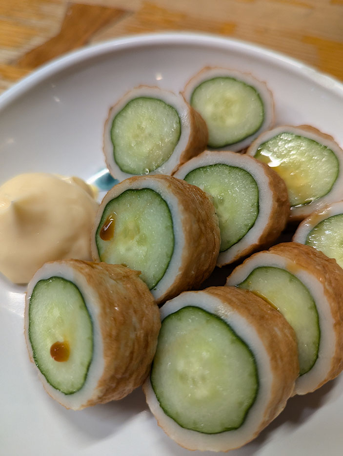 竹輪きゅうりとクジラ串揚げと餃子をつまみにノンアルコールビールを飲む。ええ感じや。焼鯖棒寿司をテイクアウトして、これで夕食もバッチリ。