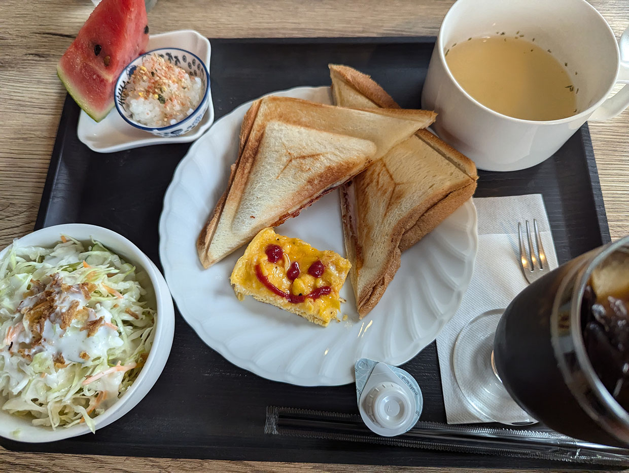 チーズとハムのホットサンドセットを注文。サクサクのパンに溶けたチーズが絡み合って、これがまた朝には贅沢すぎる味わいだった。