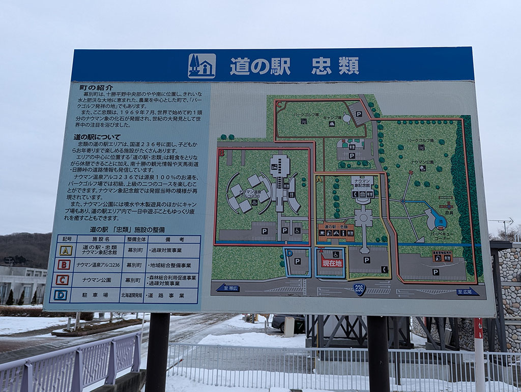 道の駅「忠類」は、北海道中川郡幕別町忠類白銀町に位置し、ナウマン象の歴史や温泉、特産品を楽しめる施設です。