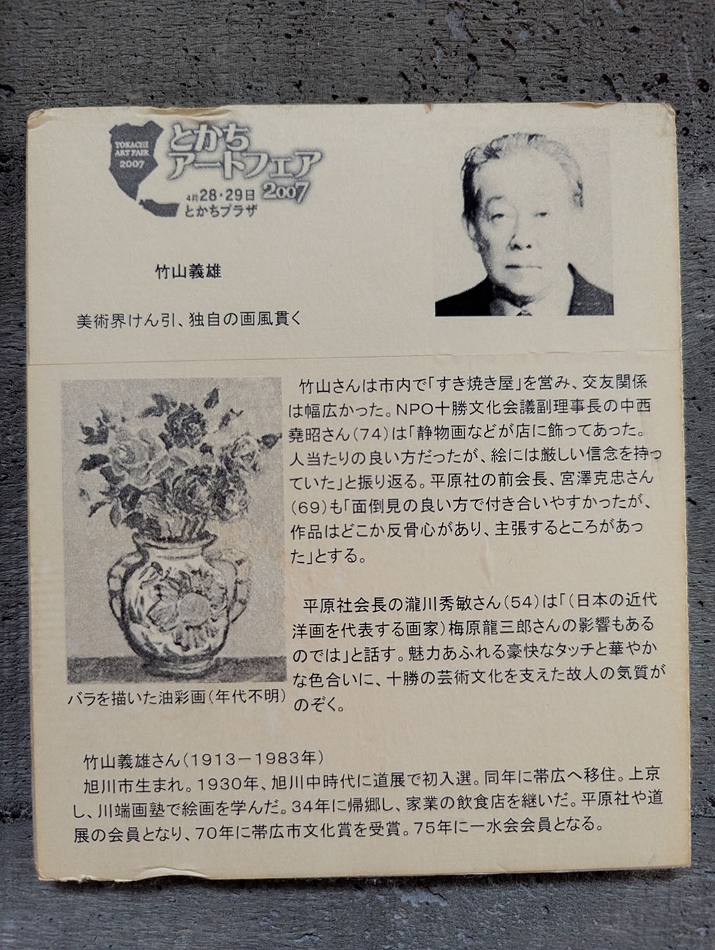 竹山さんは市内で「すき焼き屋」を営み、交友関係は幅広かった。NPO十勝文化会議副理事長の中西 堯昭さん(74)は「静物画などが店に飾ってあった。人当たりの良い方だったが、絵には厳しい信念を持つていた」と振り返る。平原社の前会長、宮澤克忠さん (69)も「面倒見の良い方で付き合いやすかったが、作品はどこか反骨心があり、主張するところがあっ た」とする。
